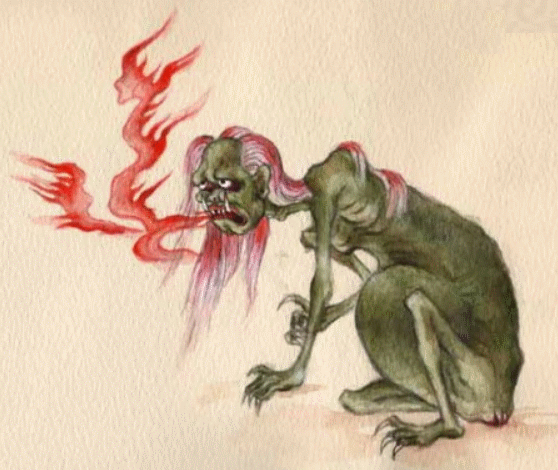 - Ngạ quỉ này tên AGGIJᾹ mắt sưng lòi ra ngoài, lửa cháy đầy mình, khói lên nghi ngút cả ngày lẫn đêm da thịt phồng lên lở lói đầy mình, cháy nóng từ trong tràn ra ngoài, miệng đói khát vô cùng nhưng không chết vì nghiệp ác tạo nên, thường ở nơi núi rừng gần mé biển hoặc cồn bãi.