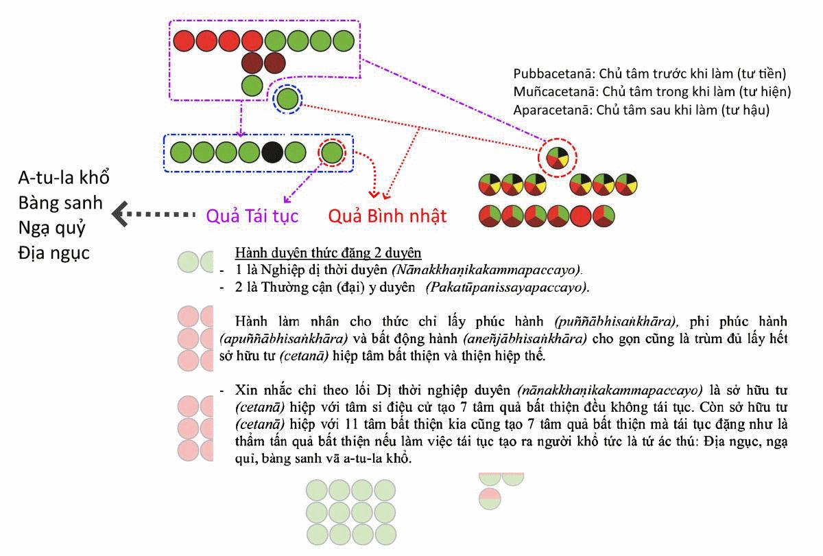 → Nghiệp sơ thiền thiện trợ tạo sơ thiền quả. → Nghiệp nhị thiền thiện trợ tạo nhị thiền quả. → Nghiệp tam thiền thiện trợ tạo tam thiền quả. → Nghiệp tứ thiền thiện trợ tạo tứ thiền quả. → Nghiệp ngũ thiền thiện trợ tạo ngũ thiền quả. → Nghiệp không vô biên xứ thiện trợ tạo không vô biên xứ quả. → Nghiệp thức vô biên xứ thiện trợ tạo thức vô biên xứ quả. → Nghiệp vô tâm sở xứ thiện trợ tạo vô tâm sở xứ quả. → Nghiệp phi tưởng phi phi tưởng xứ thiện trợ tạo phi tưởng phi phi tưởng xứ quả. → Nghiệp sơ đạo trợ sơ quả. → Nghiệp nhị đạo trợ nhị quả. → Nghiệp tam đạo trợ tam quả. → Nghiệp tứ đạo trợ tứ quả. Nếu đạo có thiền bậc nào thời quả cũng đặng thiền bậc ấy. Akusalo dhammo abyākatassa dhammassa nānakkhaṇikakammapaccayena paccayo Pháp bất thiện trợ pháp vô ký bằng dị thời nghiệp duyên. 12 tâm bất thiện quá khứ đời này hoặc các đời trước để chủng tử (bīja) hay ảnh hưởng mãnh lực tạo 7 thứ tâm quả bất thiện và sắc nghiệp, nhưng nghiệp sanh chung với tâm điệu cử tạo quả tái tục không đặng. Nghiệp Hành Hành (saṅkhāra) nghĩa là nghiệp hành (kamma saṅkhāra) hay 29 tư (cetanā) phối hợp với 17 tâm thiện hiệp thế (lokiyakusala citta) và 12 tâm bất thiện (akusalacitta). ![]() Vô minh duyên Hành Hành có 3: