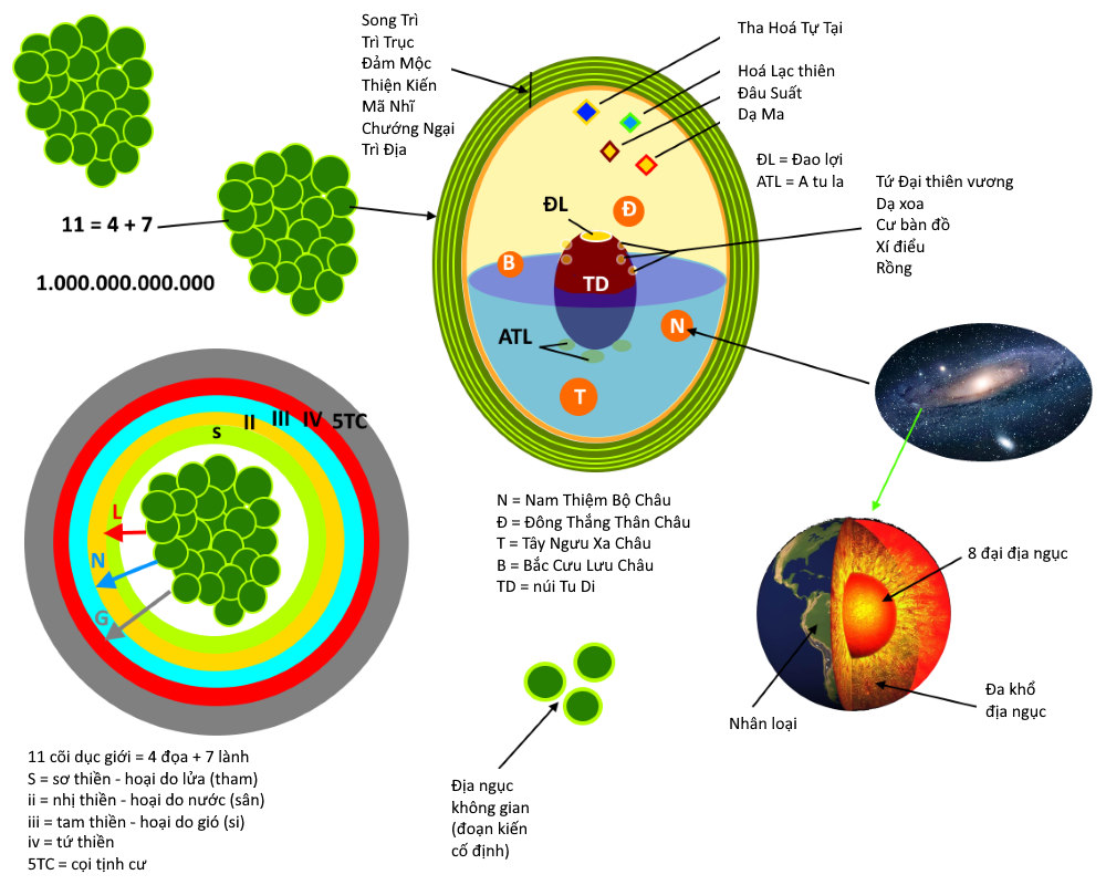2 : KAPPAKhoảng thời gian trụ rất lâu gọi là kappa (kiếp), là tên của tuổi thọ trái đất, hoặc là tên tuổi thọ cõi không gian (okāsa loka). Tiếng gọi là không gian ấy trong bộ kinh Visuddhimagga (Thanh-Tịnh-Đạo) giải rằng: đặc chỉ về chỗ ở của chúng sanh, hằng có sự tiêu hại là thường. Trong cõi không gian đó có nhiều cõi sa-bà thế giới (cakkavāla). Cõi sa-bà ta đang ở nầy có bề ngang và bề dọc đến một triệu hai ức ba ngàn bốn trăm năm chục do tuần (1.203.450 do tuần). Bề chu vi đến ba triệu sáu ức một vạn ba trăm năm chục do tuần (3.610.350 do tuần). Bề dài trái đất trong sa-bà thế giới nầy chừng hai ức bốn vạn do tuần (240.000 do tuần). - Nước nâng đỡ trái đất dày đến bốn ức tám vạn do tuần (480.000 do tuần). - Có quả núi gọi là Tu-Di sơn (Sineru), chân ăn sâu xuống trong biển đến tám muôn bốn ngàn do tuần (84.000 do tuần) chót núi cao lên cũng tám vạn bốn ngàn do tuần giống nhau. - Kế cận núi Tu-Di sơn ấy lại có Thất-Trùng sơn (Satta Paribhaṇda) nữa là: 1. Núi Yugandhara cao 42.000 do tuần. 2. Núi Isindhara cao 21.000 do tuần. 3. Núi Karavīka cao 10.500 do tuần. 4. Núi Sudassana cao 5.250 do tuần. 5. Núi Nemindhara cao 2.625 do tuần. 6. Núi Vinataka cao 1.312 do tuần. 7. Núi Assakaṇṇa cao 656 do tuần. Cả Thất-Trùng sơn nầy toàn là núi kết thành bằng bảo vật (ratana), nhất là vàng, bạc v.v... có chân ăn sâu vào dưới biển cũng đồng như trên vậy, ở bọc quanh núi Tu-Di, cách khoảng xa nhau cũng bằng với bề cao của các núi ấy. Nơi khoảng cách những núi ấy toàn là biển gọi tên là Sīdantara. Cả bảy lớp núi nầy là nơi trú của Tứ-Đại Thiên-Vương: 1. Dhata Raṭṭha. 2. Virūpakkha 3. Virullahaka. 4. Kuvera. ![]() Và là nơi trú, nơi đi lại của chư thiên, và dạ-xoa cả thảy. Chẳng phải trình độ của người thường đi đến và xem thấy hoặc nghĩ ngợi được đâu, chỉ có Đức Phật và các vị A-la-hán mới đi đến và xem thấy biết rõ đầy đủ. Núi lớn Sineru, có ba hòn núi lớn dở phía dưới, gọi là núi Trayakuṭa. Phía trên đỉnh núi Tu-Di sơn là địa phận của đức vua trời Đế-Thích (Sakka), gọi là cõi trời Đạo-Lợi, kế phía trên là cõi Dạ-Ma, Đâu-Suất-Đà, Hóa-Lạc, Tha-Hóa-Tự-Tại. Tất cả các cõi nầy là nơi trú của chư thiên, chẳng phải chỗ ở của loài người đâu. Kế phía trên các cõi trời nữa là cõi của chư Phạm-Thiên Hữu-sắc và Phạm-Thiên Vô-sắc. Phạm-Thiên Hữu sắc có 16 tuần là: 1. Phạm-Chúng thiên. 2. Phạm-Phụ thiên. 3. Đại-Phạm. 4. Thiếu-Quan thiên. 5. Vô-Lượng quang thiên. 6. Quang-Âm thiên. 7. Thiếu-Tịnh thiên. 8. Vô-Lượng tịnh thiên. 9. Biến-tịnh thiên. 10. Quản-quả thiên. 11. Vô-Tưởng thiên. 12. Vô-Phiền thiên. 13. Vô-Nhiệt thiên. 14. Thiện-Hiện thiên. 15. Thiện-Kiến thiên. 16. Vô-thiểu thiên. Phạm-thiên vô sắc có bốn tầng là: 1. Không vô biên xứ thiên. 2. Thức vô biên xứ thiên. 3. Vô-sở hữu xứ thiên. 4. Phi-Tưởng Phi-Phi tưởng thiên. Cõi trời Phi-Tưởng phi phi tưởng xứ này là nơi cao nhất hơn cả của Tam-Giới, trong cõi hư không thế giới khoảng cách xa cõi cuối cùng Tam-Giới ấy xuống đến cõi người nầy không thể đếm được bao nhiêu do tuần cả. Trong bộ kinh Loka Dīpaka có giảng giải so sánh rằng: Sabba bhavaggo thatvaca kutāgarasamāsalā pātitā tīhi vassedhivimā māsehi ca atthahi rattindivehi ... Nghĩa là: Chư thiên có thần lực nhiều, ở trong cõi cuối cùng (của Tam-Giới) thả một tảng đá to bằng cái nhà cho rơi xuống tới cõi người mất một thời gian rất lâu chừng ba năm hai tháng tám ngày và 14 phút mới đến cõi người, cục đá ấy chỉ là chạm bởi gió, mà mòn hết chỉ còn dư lại bằng trái cam thôi. Kế sau đây chỉ giảng giải theo bộ kinh Visuddhi magga như vầy: Theo sự chỉ dẫn rằng: Núi Tu-Di (Sineru) ở giữa cõi Sa-bà, núi Thất-Trùng sơn bao quanh núi Sineru, phía bên ngoài núi Thất-Trùng sơn ấy, toàn là nước cả thảy, trong bốn hướng có Tứ-Đại châu cách xa hẳn với núi ấy. | |