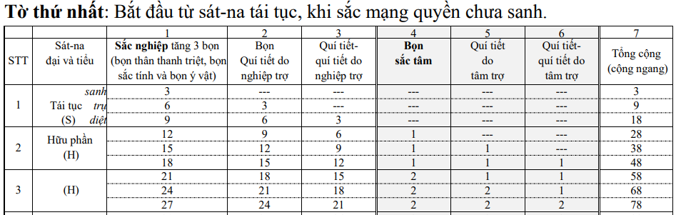 Cột thứ sáu (4) nói về sắc tâm là nói về sắc tâm hộ kiếp thứ nhứt tạo đồng thời sát-na sanh của nó đặng 1 bọn sắc tâm, về sau mỗi cái tâm đều như thế, nên 3 sát-na tiểu tăng 1 bọn sắc tâm. Đến cái tâm 17 kể từ tâm hộ kiếp thứ nhất là tâm khán ý môn thì bình số đủ 17 bọn, từ cái tâm này về sau mỗi sát-na diệt đều có 1 bọn sắc tâm diệt mỗi cái tâm sanh đều có 1 bọn sắc tâm sanh đồng với sát-na sanh, nên vừa bớt trong khi sát-na diệt của mỗi cái tâm liền thêm trong khi sát-na sanh của mỗi cái tâm sanh kế đó. Cột thứ bảy (5) nói về sắc âm dương tâm trợ, nghĩa là sắc âm dương mà do sắc tâm trợ tạo ra, nên trễ hơn sắc tâm 1 sát-na tiểu. Khởi từ sát-na trụ của tâm hộ kiếp thứ nhất sanh đặng 1 bọn cách 2 sát-na tiểu hay mỗi sát-na trụ của tâm đều sanh tăng thêm 1 bọn cho đến sát-na trụ của tâm khán ý môn đủ 17 bọn là bình số. Từ đây mỗi sát-na sanh của tâm đều có diệt, mỗi sát-na trụ của tâm đều có sanh. Cột thứ tám (6) nói về sắc âm dương âm dương tâm trợ, nghĩa là sắc âm dương này do sắc âm dương mà nhờ sắc tâm trợ đó, giúp lại sắc âm dương tâm trợ 1 sát-na tiểu, tức là khởi từ sát-na diệt của tâm hộ kiếp thứ nhất sanh 1 bọn thì mỗi sát-na diệt của cái tâm về sau đều sanh thêm 1 bọn cho đến sát-na diệt của tâm khán ý môn đặng 17 bọn bình số luôn. Vì từ đây về sau mỗi sát-na trụ của tâm có diệt 1 bọn, mỗi sát-na diệt của tâm đều có sanh 1 bọn. Cột chót (7) tổng cộng của các cột khoảng trước: Hàng thứ nhất chỉ đặng 3 bọn sắc đầu thai. Hàng thứ hai sanh đặng 9 bọn là 6 bọn sắc nghiệp, 3 bọn sắc âm dương nghiệp trợ. Hàng thứ ba sanh đặng 18 bọn là 9 bọn sắc nghiệp, 6 bọn sắc âm dương nghiệp trợ và 3 bọn sắc âm dương âm dương nghiệp trợ. Hàng thứ tư sanh đặng 28 bọn: 12 bọn sắc nghiệp, 9 bọn sắc âm dương nghiệp trợ, 6 bọn âm dương âm dương nghiệp trợ và 1 bọn sắc tâm.