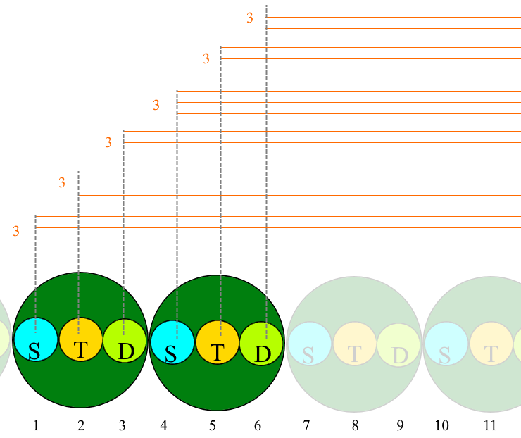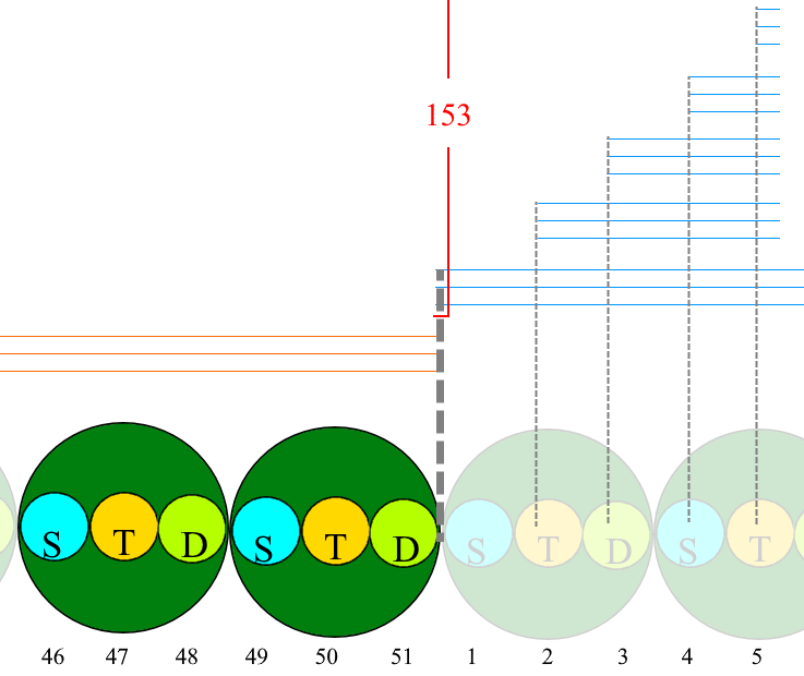 Xin để ý, chỉ có 2 bọn sắc tiêu biểu sanh diệt đồng với tâm, ngoài ra các bọn sắc khác sanh, trụ, diệt kéo dài thời gian 51 sát-na tiểu (sanh 1 sát-na tiểu, trụ 49 sát-na tiểu, diệt 1 sát-na tiểu) xem bản đồ phụ. Cột thứ tư (2) chỉ số bọn sắc âm dương do sắc nghiệp trợ, nên gọi là sắc âm dương nghiệp trợ, cách tăng như cột trên. Sắc nghiệp trễ hơn 1 sát-na tiểu. Vì sát-na sanh của sắc nghiệp không thể trợ cho sắc âm dương sanh, đến sát-na trụ thứ nhất thì sắc nghiệp mới giúp cho âm dương sanh, mỗi 3 bọn sắc nghiệp đều giúp như thế. Cho nên khởi đầu của sắc âm dương nghiệp trợ từ sát-na tiểu thứ 2 là sát-na trụ của tâm đầu thai sanh đặng 3 bọn cho đến có diệt là bình số 153. Cột thứ năm (3) nói về sắc âm dương do sắc âm dương nghiệp trợ đó giúp phát sanh ra nữa, nên trễ hơn 1 sát-na. Bắt đầu sát-na diệt của tâm tục sinh là sát-na thứ 3 cho đến có bình số 153 bọn. Phải trễ hơn phần sắc âm dương nghiệp trợ 1 sát-na, sắc âm dương này gọi là âm dương trợ âm dương. Từ đây về sau trợ nhau sanh âm dương rất theo hình vóc lớn nhỏ và sắc âm dương do mạng căn, tâm và vật thực trợ cũng thế.