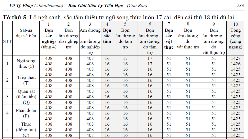 - Tờ thứ năm nói về lộ ngũ, sắc tâm thiếu 1 khoảng 51 sát-na tiểu.