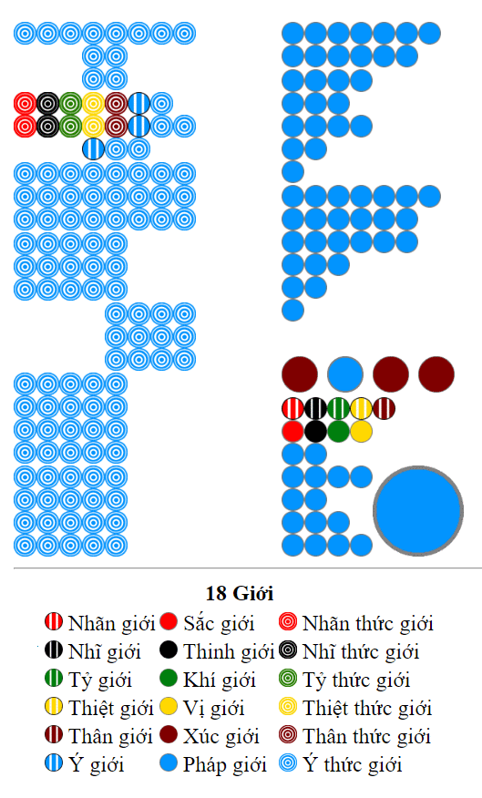 | Thập bát giới như là  nhãn giới, sắc giới, nhãn thức giới, nhĩ giới, thinh giới, nhĩ thức giới, tỷ giới, khí giới, tỷ thức giới, thiệt giới, vị giới, thiệt thức giới, thân giới, xúc giới, thân thức giới, ý giới, pháp giới, ý thức giới.  | 183. Aṭṭhārasa dhātuyo –  cakkhudhātu, rūpadhātu, cakkhuviññāṇadhātu, sotadhātu, saddadhātu, sotaviññāṇadhātu, ghānadhātu, gandhadhātu, ghānaviññāṇadhātu, jivhādhātu, rasadhātu, jivhāviññāṇadhātu , kāyadhātu, phoṭṭhabbadhātu, kāyaviññāṇadhātu, manodhātu, dhammadhātu, manoviññāṇadhātu.  |