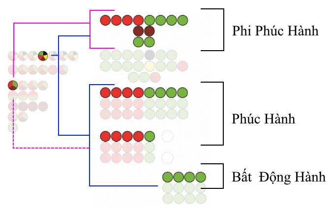 → Nghiệp sơ thiền thiện trợ tạo sơ thiền quả. → Nghiệp nhị thiền thiện trợ tạo nhị thiền quả. → Nghiệp tam thiền thiện trợ tạo tam thiền quả. → Nghiệp tứ thiền thiện trợ tạo tứ thiền quả. → Nghiệp ngũ thiền thiện trợ tạo ngũ thiền quả. → Nghiệp không vô biên xứ thiện trợ tạo không vô biên xứ quả. → Nghiệp thức vô biên xứ thiện trợ tạo thức vô biên xứ quả. → Nghiệp vô tâm sở xứ thiện trợ tạo vô tâm sở xứ quả. → Nghiệp phi tưởng phi phi tưởng xứ thiện trợ tạo phi tưởng phi phi tưởng xứ quả. → Nghiệp sơ đạo trợ sơ quả. → Nghiệp nhị đạo trợ nhị quả. → Nghiệp tam đạo trợ tam quả. → Nghiệp tứ đạo trợ tứ quả. Nếu đạo có thiền bậc nào thời quả cũng đặng thiền bậc ấy. Akusalo dhammo abyākatassa dhammassa nānakkhaṇikakammapaccayena paccayo Pháp bất thiện trợ pháp vô ký bằng dị thời nghiệp duyên. 12 tâm bất thiện quá khứ đời này hoặc các đời trước để chủng tử (bīja) hay ảnh hưởng mãnh lực tạo 7 thứ tâm quả bất thiện và sắc nghiệp, nhưng nghiệp sanh chung với tâm điệu cử tạo quả tái tục không đặng. Nghiệp Hành Hành (saṅkhāra) nghĩa là nghiệp hành (kamma saṅkhāra) hay 29 tư (cetanā) phối hợp với 17 tâm thiện hiệp thế (lokiyakusala citta) và 12 tâm bất thiện (akusalacitta). ![]() Vô minh duyên Hành Hành có 3: