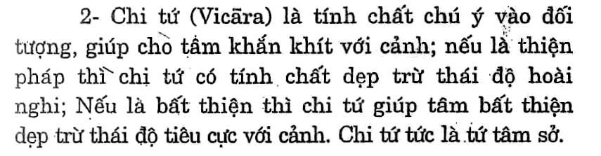 Tứ (vicāra): Tâm sở Tứ là tâm sở có chức năng giúp tâm và tâm sở đồng sanh làm việc rà soát đối tượng. Khi là chi thiền, tâm sở Tứ giúp chận đứng Hoài Nghi. Tầm giống như sự vỗ cánh của con chim và Tứ thì giống như sự chao lượn của con chim. Hoặc cũng có thể nói Tầm là âm thanh ban đầu của chiếc trốngvà Tứ là âm hưởng dư sót của tiếng động đó.