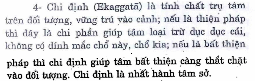11. Katamā tasmiṃ samaye cittassekaggatā hoti? Yā tasmiṃ samaye cittassa ṭhiti saṇṭhiti avaṭṭhiti avisāhāro avikkhepo avisāhaṭamānasatā samatho samādhindriyaṃ samādhibalaṃ sammāsamādhi – ayaṃ tasmiṃ samaye cittassekaggatā hoti. | Thế nào là nhất hành tâm trong khi ấy? Trong khi ấy, đối với tâm có pháp là sự đình trụ, sự vững trú, sự vững vàng, sự không tán loạn, sự không lao chao, tính cách tâm không xao xuyến, chỉ tịnh, định quyền, định lực, chánh định. Ðây là nhất hành tâm trong khi ấy. |
